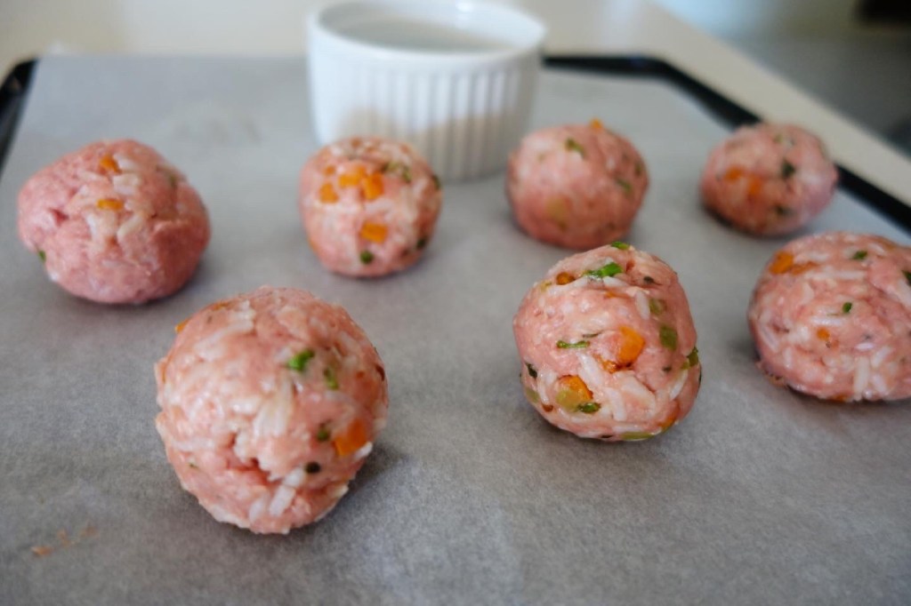 6. Place on a tray. Place an oven proof bowl filled with water alongside the rice balls.